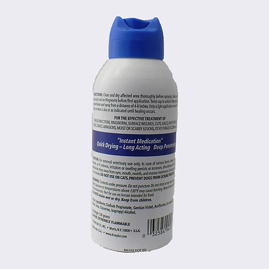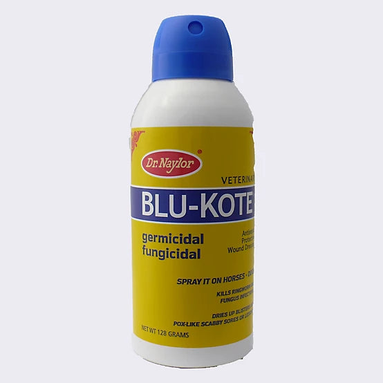 The Dr. Naylor Blu-Kote Aerosol Livestock Wound Spray is an effective livestock wound spray for treatment of surface wounds, abrasions, and ringworm. This antiseptic, fast-drying Blu-Kote wound care spray is highly effective against pus-producing bacteria and common fungus infections. Use this anti-fungal spray to penetrate and reduce pus formation and dry up secretions of pox-like lesions. Made in America.