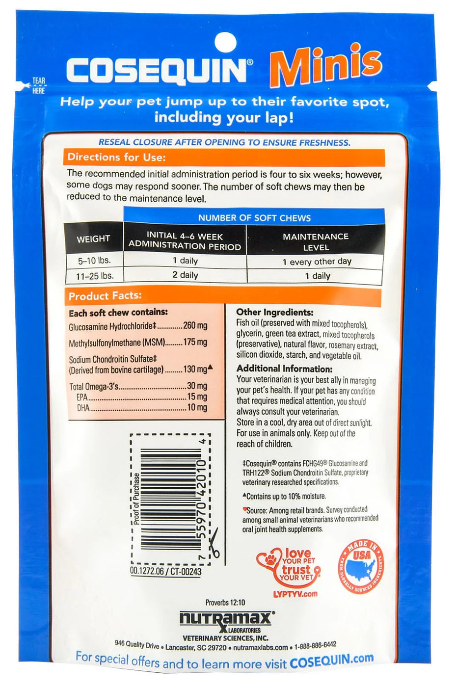 Cosequin Minis Joint Health Supplement with Omega-3 for Small Dogs combines glucosamine hydrochloride and sodium chondroitin sulfate for joint support. Cosequin joint health supplements are brought to you by Nutramax Laboratories Veterinary Sciences, the #1 veterinarian recommended supplement company. Source: Among retail brands. Survey conducted among small animal veterinarians who recommended oral joint health supplements.