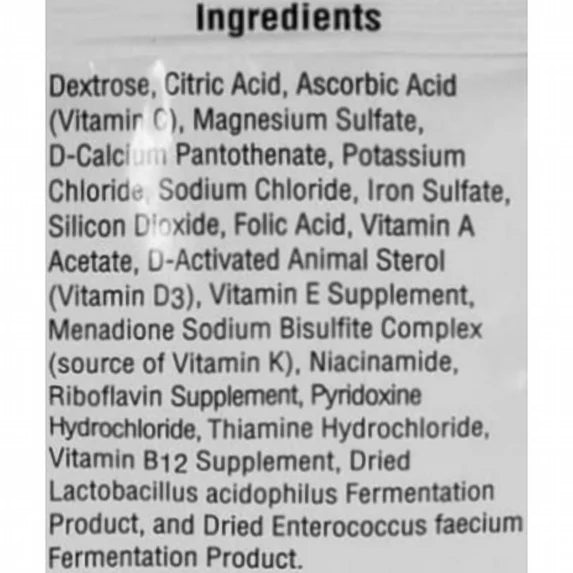 Soluble vitamin supplement powder which includes Vitamin A Supplement, Vitamin D Supplement, Vitamin E Supplement, Menadione Sodium Bisulfite Complex (source of Vitamin K activity), Niacin Supplement, Riboflavin Supplement, Calcium Pantothenate, Pyridoxine Hydrochloride, Folic Acid, Thiamine Mononitrate, Vitamin B12 Supplement, Citric Acid, Ascorbic Acid, Magnesium Sulfate, Calcium Chloride, Potassium Chloride, Sodium Chloride, Iron Sulfate Monohydrate, Dried Lactobacillus Acidophilus, Dried Streptococcus Facium, Dextrose
