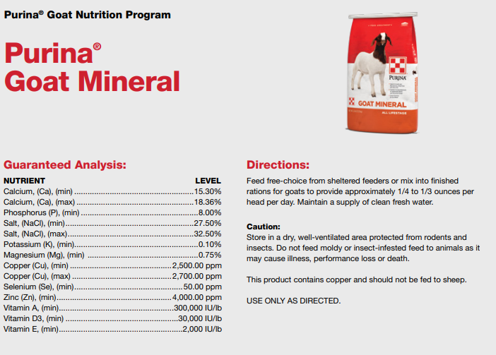 Purina Goat Mineral is a uniquely formulated goat supplement, rich in nutrients that are essential to the proper development and well-being of goats of all ages and breeds. This coarse particle goat mineral feed is designed to support a healthy immune system and growth, bone and hoof development, reproduction and milk production in goats. Purina Goat Mineral is now reformulated with even higher calcium levels to support healthy parturition, an Availa 4 package for increased bioavailability, and elevated copper levels for reproduction and health.