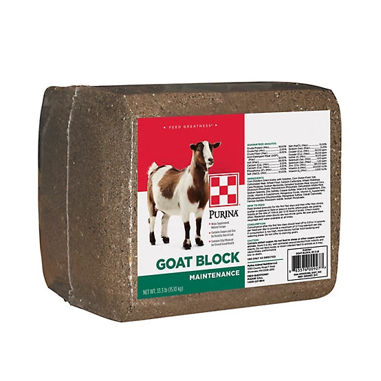 Formulated to supplement goats on range or pasture. An 18%- protein highly fortified supplemental feed designed to enhance a goat's diet on native range or pasture. Purina Goat Block contains the essential vitamins and minerals needed to meet a goat's nutritional requirements. Added protein helps support muscle growth in kids and milk production in lactating does.