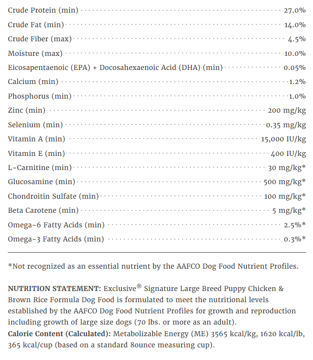 Exclusive® Signature Large Breed Puppy Chicken & Brown Rice Formula Dog Food with the Comfort Care™ Digestive Health Support System is formulated with a unique combination of scientifically-studied ingredients including beet pulp (fiber), chicory root (probiotic) and a proprietary yeast (prebiotic) to help support digestive health today while preparing your puppy for what comes tomorrow.