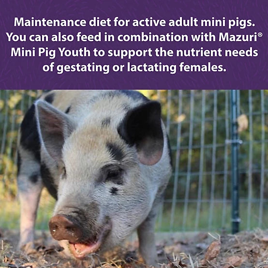 Keep mini pigs moving as they grow. The Mazuri Active Adult Mini Pig Feed is a moderate-energy, high-fiber food that can be used as a maintenance diet for active adult pigs. You can also feed in combination with Mazuri Mini Pig Youth to support the nutrient needs of gestating or lactating females. Our pellets have a taste your pigs will get excited about at every meal, and complete nutrition you can rely on for their lifetime. The feed also contains yucca schidigera extract to help control manure odors. Available as a 25 lb. bag of pellets. Made in the USA.