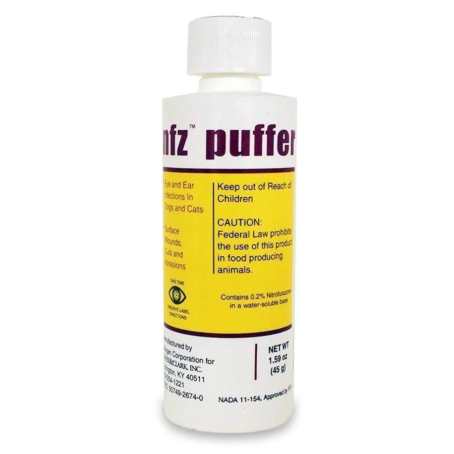 NFZ™ puffer is an FDA approved antibacterial powder administered topically for the treatment of ear and eye infections, surface wounds, cuts and abrasions in dogs and cats.