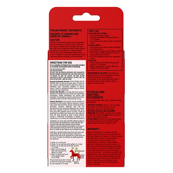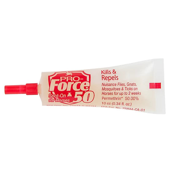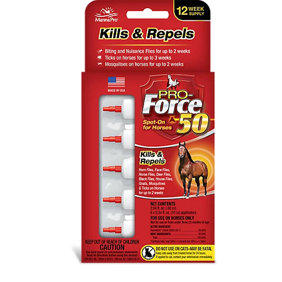The Manna Pro Pro Force 50 Spot On for Horses kills and repels biting and nuisance flies, ticks and mosquitoes for up to 6 weeks. Each tube is good for 2 weeks each when applied as directed. This spot treatment comes ready to use for convenience.