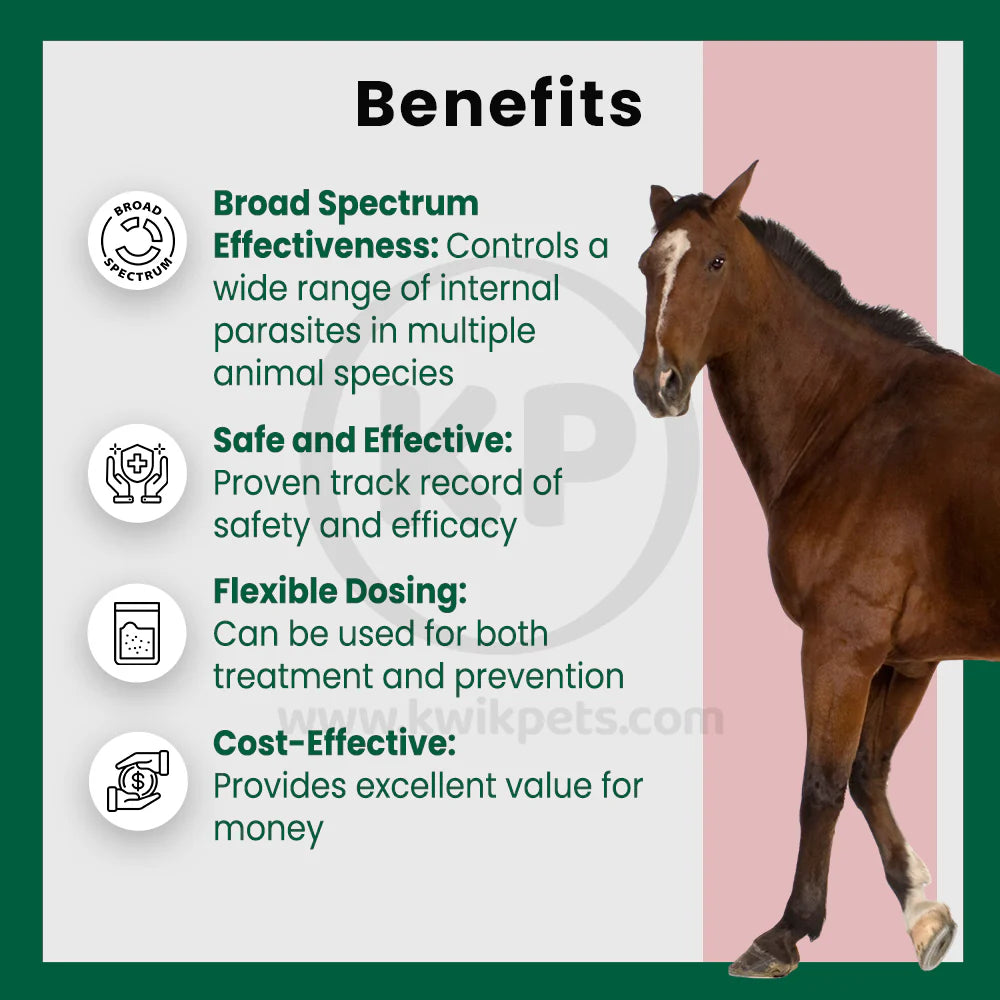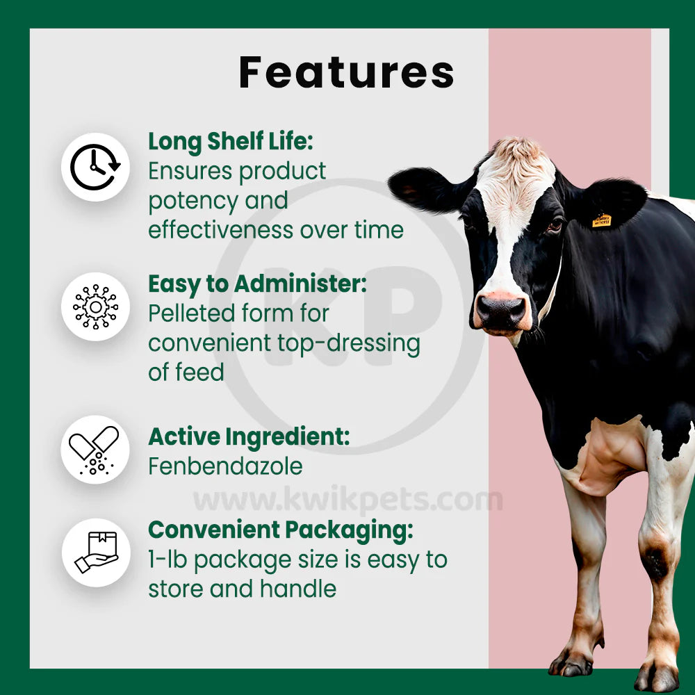 Multi-species dewormer. Internal parasite control is the cornerstone of an effective animal health program. The active ingredient fenbendazole offers strategic deworming solutions for your animals. Goes straight to the gut, killing the parasites where they live. Labeled for the use in cattle (dairy & beef), swine, and horses. Alfalfa-based pellets. Not for use in humans