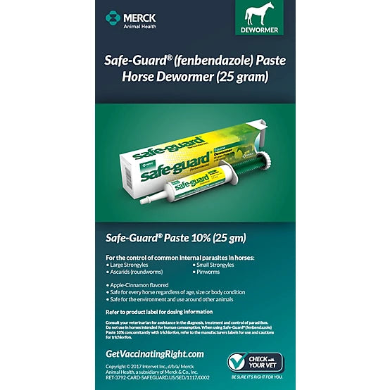 Treat your horses with Safe-Guard Animal Health Equine Dewormer Paste. The antiparasitic action of Safe-Guard (fenbendazole) Paste 10% is believed to be due to the inhibition of energy metabolism in the parasite, and each gm of Safe-Guard (fenbendazole) horse worm medicine contains 100 mg of fenbendazole for effective treatment. The artificial apple cinnamon flavor makes it easy to use this horse wormer on your animals.