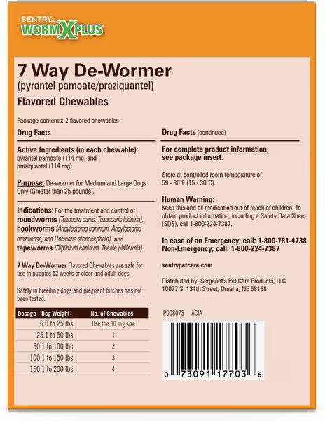 Sentry HC WormX Plus 7 WayDewormer for Hookworms, Roundworm & Tapeworms for Medium & Large Breed Dogs, 2 count