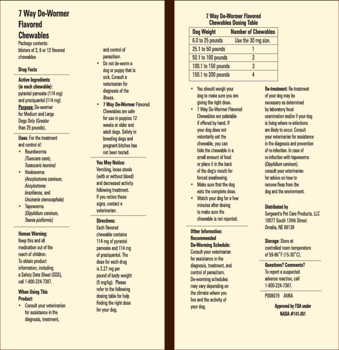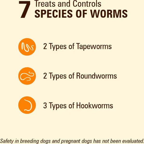 - reats seven strains of worms, including tapeworms, roundworms and hookworms.
