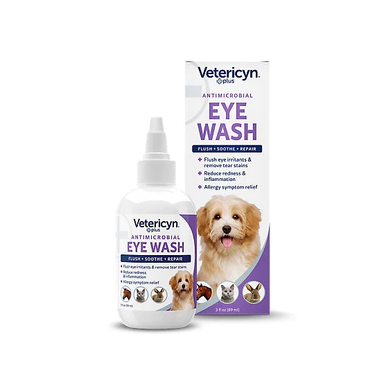 Vetericyn Plus Eye Wash for Pets is specially formulated to help soothe painful irritation in your pet's eyes by removing foreign dirt and debris without stinging or causing discomfort. It may help maintain healthy eyes and prevent the buildup of foreign material that could cause eye infections, plus help you prevent those unsightly tear-stains. From your home to the farm or ranch, Vetericyn makes caring for your pet simple and easy.