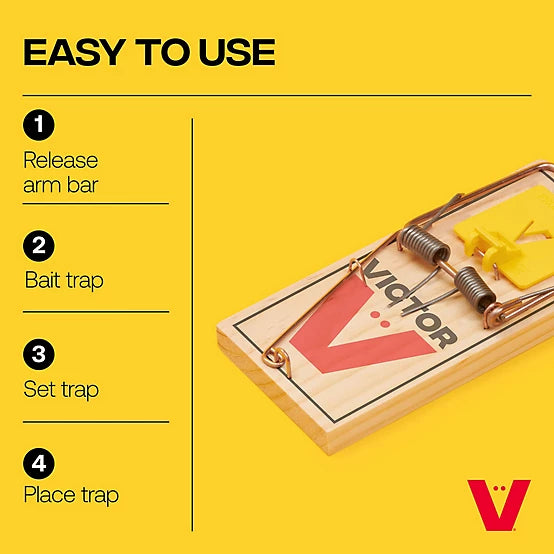 The original wood-based wire snap trap, the Victor Easy Set Rat Trap, provides immediate rodent control and is safe for household or business use. For effective rat control, each rat trap comes pre-baited with a large, expanded professional trip pedal. The large pedal of this rat trap is easily activated - both by rodent interest in food and through accidental contact as rats scamper across the floor - to ensure maximum trapping. Once a rodent triggers the pedal, the rat trap immediately springs closed to eliminate the pest on contact. The rat trap can then be easily disposed of for quick and clean removal. These traps require no chemicals or poisons, so they are an ideal rat control device for homes with kids and pets. Victor Easy Set Rat Traps are perfect for use anywhere in your home or business. For the best results, place the traps near signs of rodent activity or where you suspect rodent activity. These rat traps should be placed where rodents travel, such as along walls at 2 ft. to 3 ft. intervals.