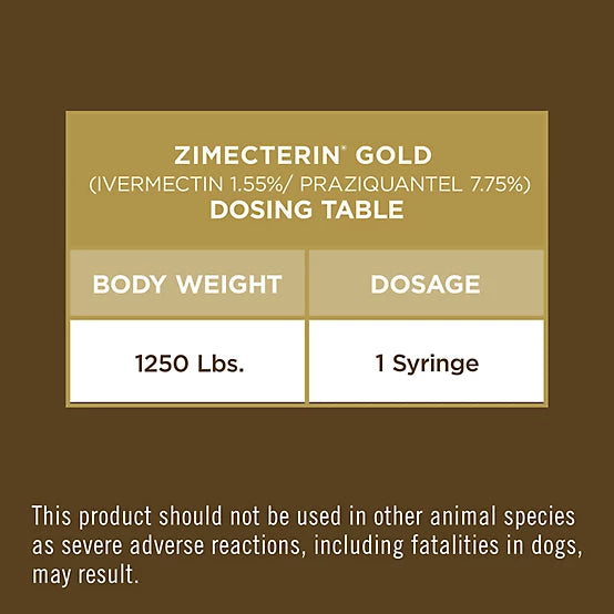 ZIMECTERIN® GOLD (ivermectin 1.55% / praziquantel 7.75%) kills important internal parasites in horses, including tapeworms, bots and the arterial stages of S. vulgaris, with a single dose.