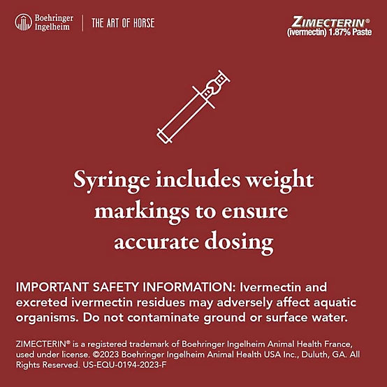 Zimecterin Paste can be used to eliminate a variety of parasites with a single dose. It's effective against large and small strongyles, pinworms, ascarids, hairworms and more. It's even effective against small strongyles that are resistant to benzimidazole products, as Zimecterin is not a benzimidazole nor an organophosphate. Pre-filled syringes, complete with weight markings, help make dosing simple and accurate. This product is for use in horses only